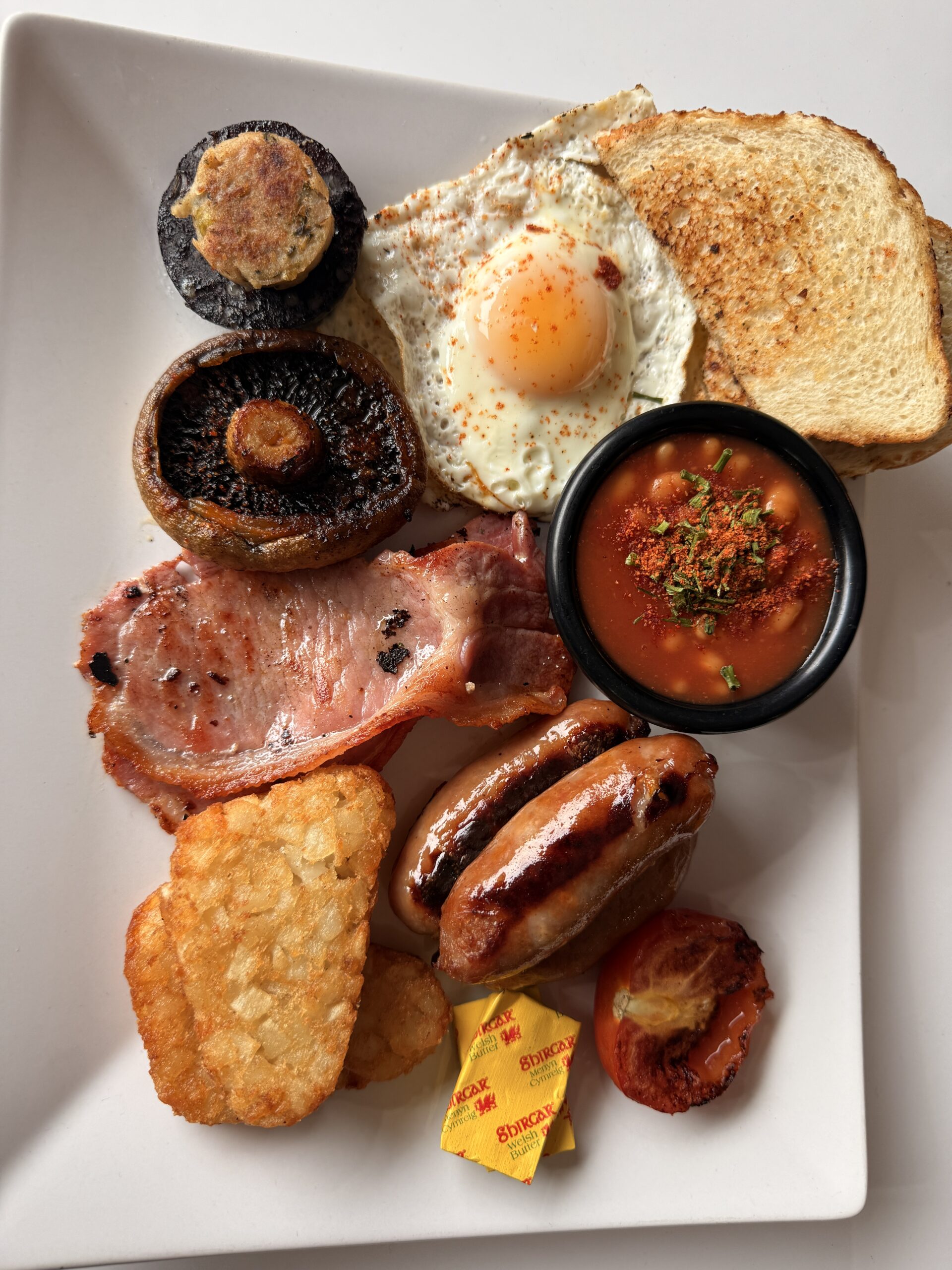 Free-range eggs, smoked bacon, Cumberland sausage, roasted tomatoes, garlic mushrooms, black pudding, cowboys baked beans served with grilled tomato and sourdough toast with Welsh butter